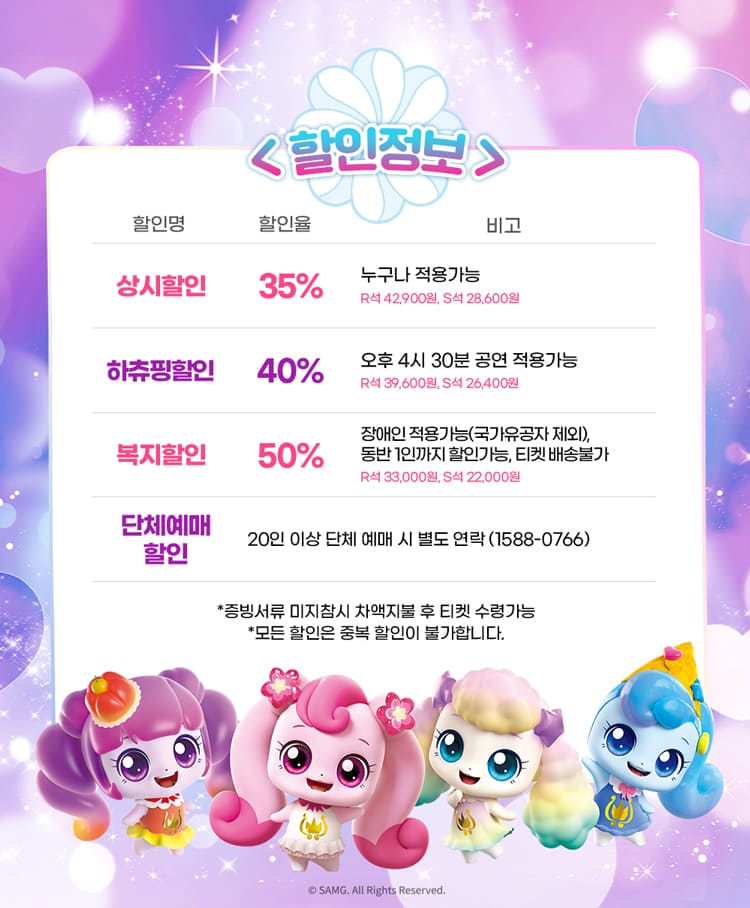 캐치티니핑 할인은 상시할인, 하츄핑할인, 복지할인 ,단체예매 할인이 가능합니다. 예매하시기 전에 잘 살펴보고 예매하시기 바랍니다.